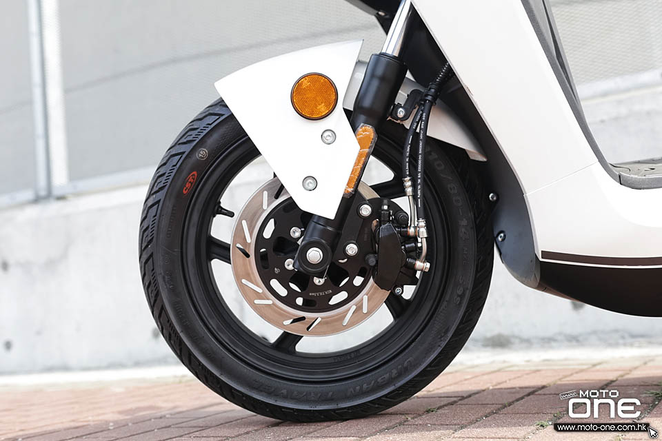 別看150cc綿羊仔的體型,乘座空間比現在流行的155cc綿羊仔更寬敞,更舒適,坐高達到780mm,算是有點高,我身高5呎6吋,穿了賽車皮鞋,雙腳可以踏地。廠方說J不包括電池,車子淨重108公斤,安裝三枚電池後大約是147公斤,比一般的150cc綿羊重10幾20公斤,所以推起來很明顯更重,可以起動停車大架都算容易。她的重量加上配置大直徑輪框,轉彎靈活度雖然沒有125cc或150cc綿羊輕盈,可是壓彎的穩定感,還有原裝正新輪胎挺咬地,感覺實在好多,始終她的身型細小,其實還是很好彎,操控沒有難度。