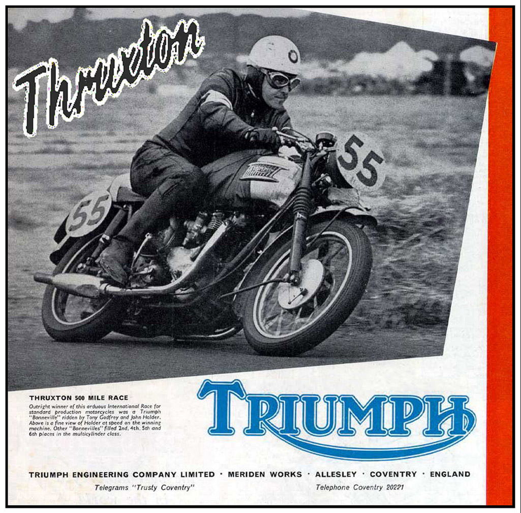 當年Thruxton 500耐力賽的賽例規定參賽車輛必須是市販車,為了符合參賽資格,Triumph利用T120 Bonnevilles,改裝了55台Triumph Thruxton出售,經過半世紀後,第一代Triumph Thruxton已所餘無幾,這款配置賽車式超窄杯士軑跑車更喻為是掀起Cafe Racer熱潮的先驅。