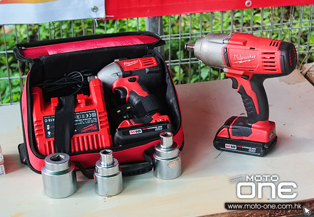 在不久前舉辦的MX CLUB活動中,目的是讓參與的車迷體驗飛天珠的起步性能(綿羊普利盤內的起動珠)。由於現場沒有風缸(風泵)及風炮,但為了方便安裝普利盤及離合器關,於是良友公司提供Milwaukee中型及小型的充電炮供在場使用。