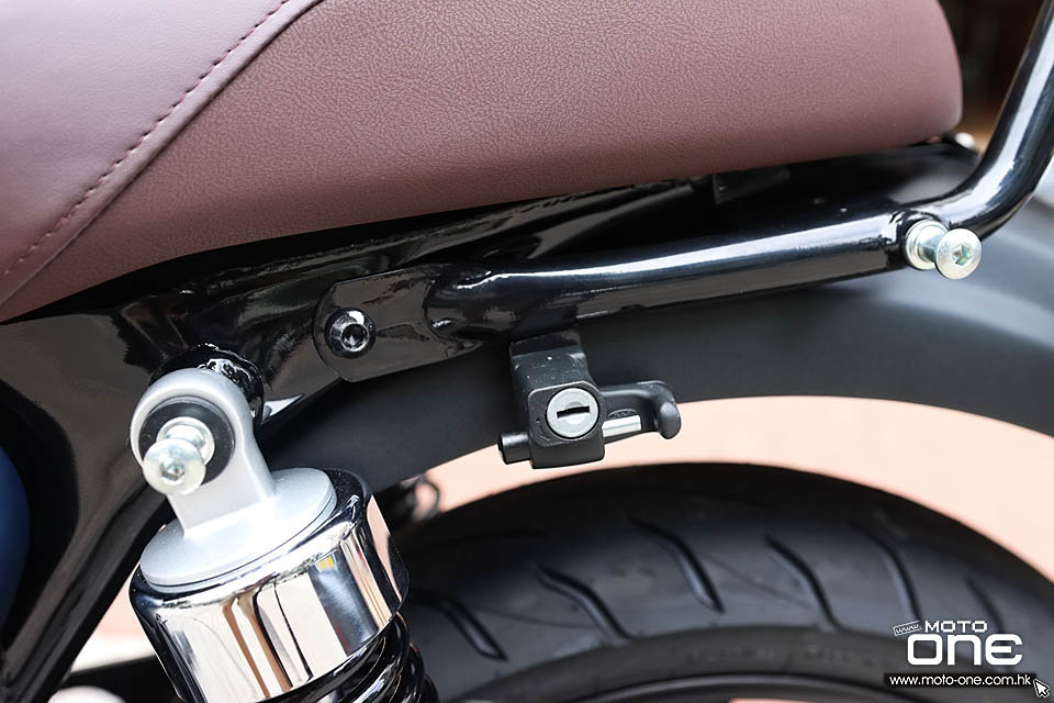 另外,後座位左下方設有頭盔鎖,而乘客挽手及尾避震頂左右共加裝了四個扣位,目的是可以於單騎時,後座位置可以使用網袋載物,添加實用性及同時完全貫徹復古的元素。而原廠已備有泊車大架,無需另行加配。