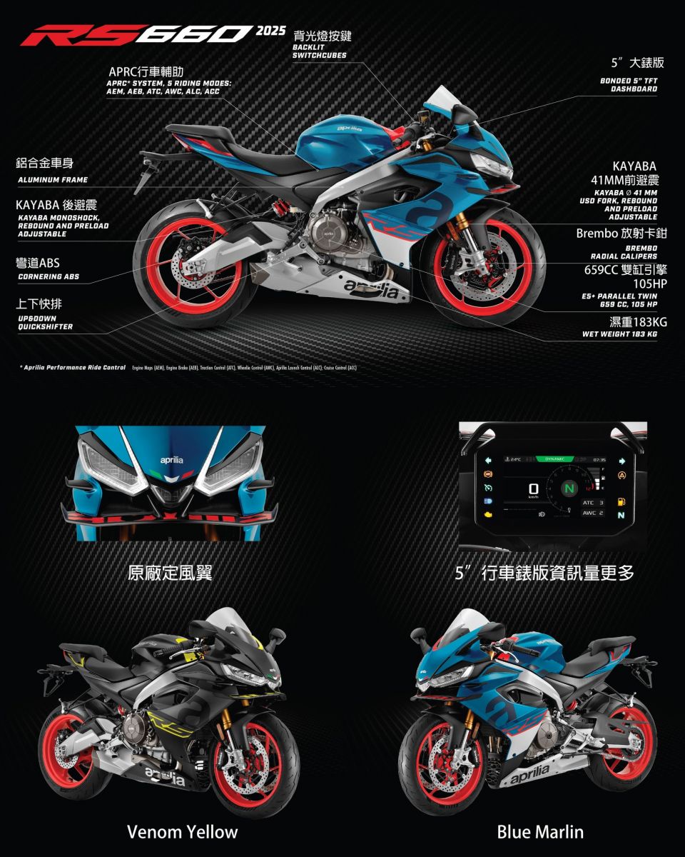 APRC 電控系統 新款 RS660 / FACTORY版採用 Aprilia 最新的 APRC(Aprilia Performance Ride Control)電控系統,新增 Aprilia Launch Control(ALC)彈射起步,可讓騎士全油門,以最快速度起步,並防止翻車。雖然此功能主要為賽道設計,但仍為 RS660 增添更多吸引力。