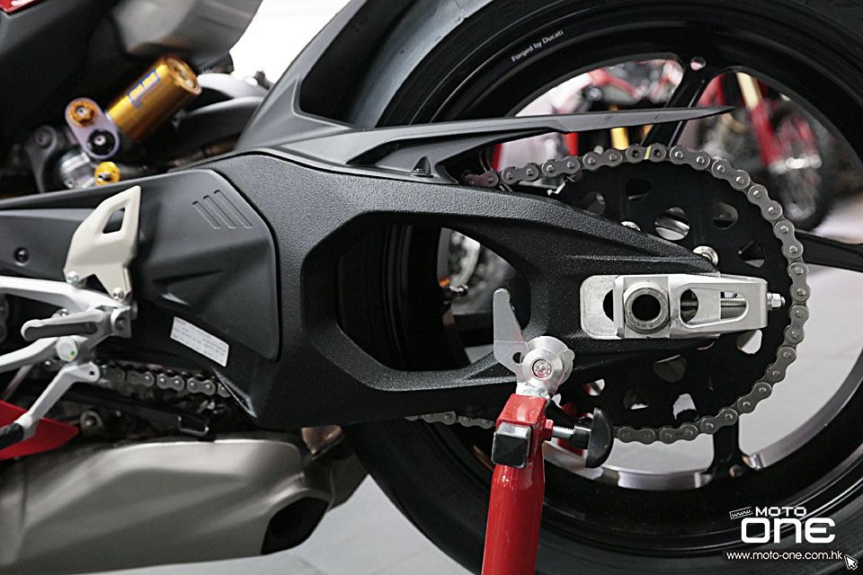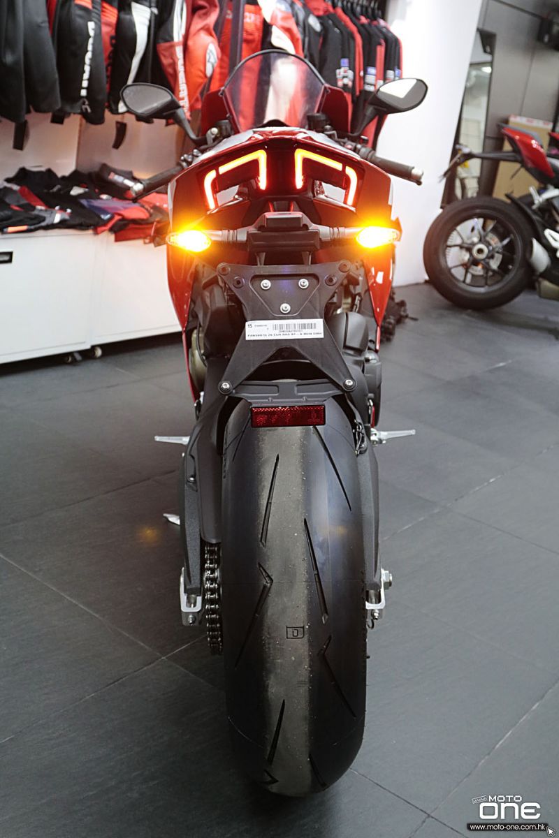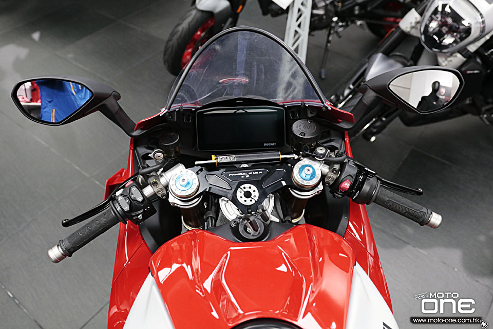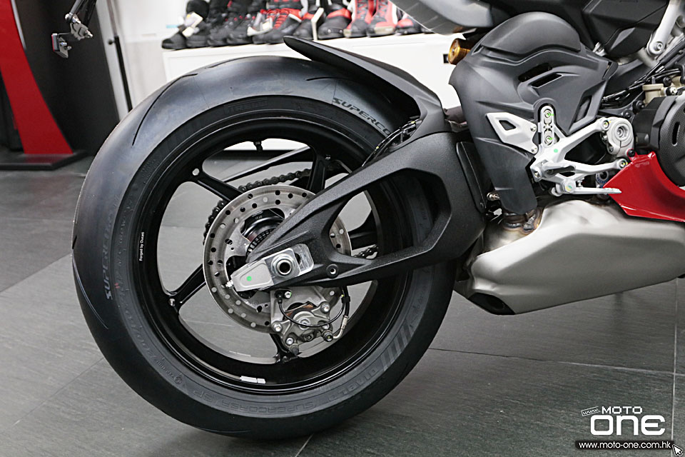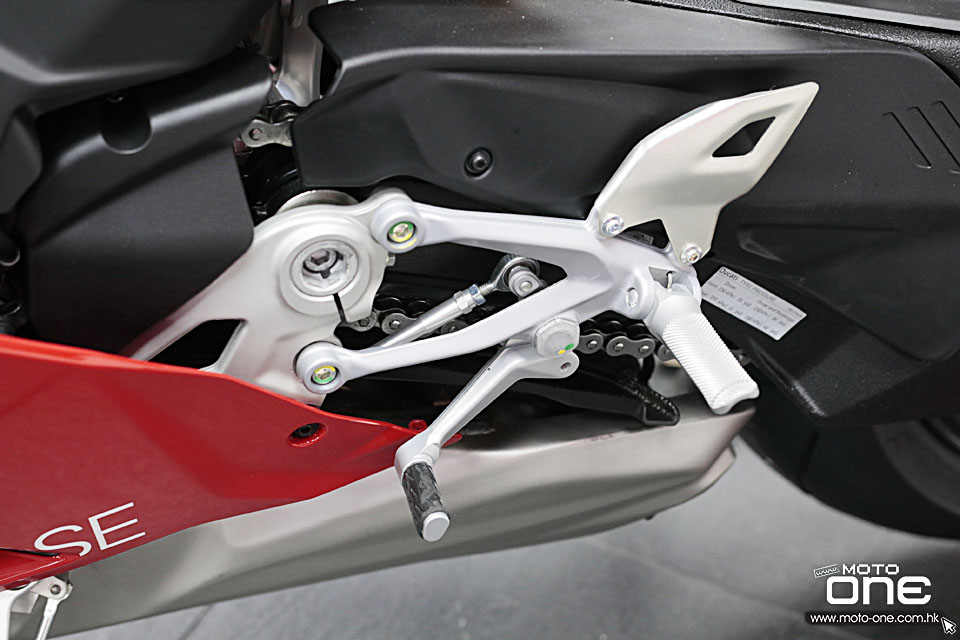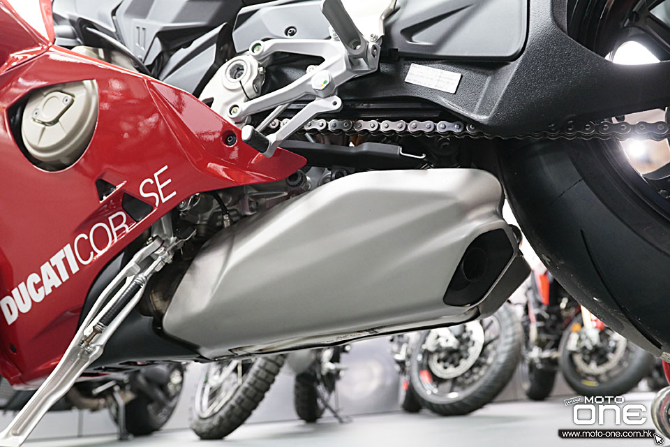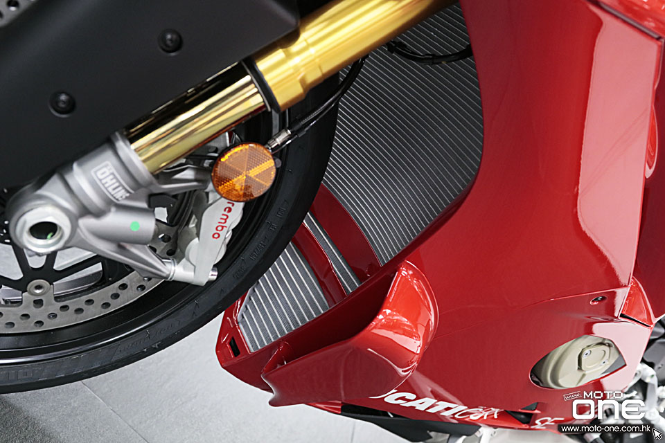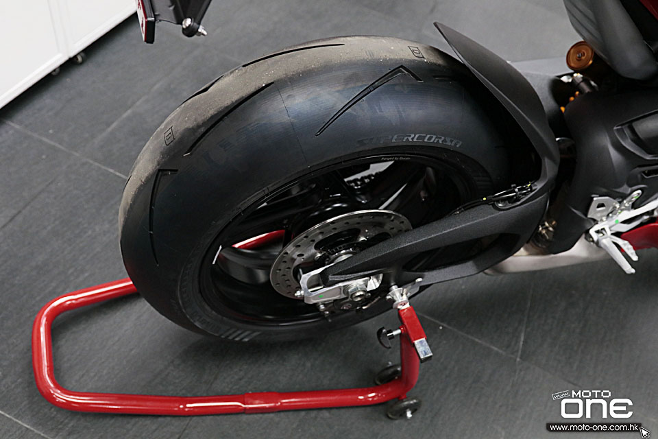 電子設備 全新 Ducati Vehicle Observer (DVO),模擬 70 個外部感測器,提升電子輔助反應。 慣性測量單元移至油缸下方,更接近重心,反應更準確。 功能包括:循跡控制 (DTC)、翹頭控制 (DWC)、側滑控制 (DSC)、彈射起步 (DPL)、引擎煞車控制 (EBC),全部可於行車中快速調整。 煞車防鎖系統有 7 個級別,分別適用賽道或公路。騎乘模式共有 5 種:Wet、Road、Sport、Race A、Race B。