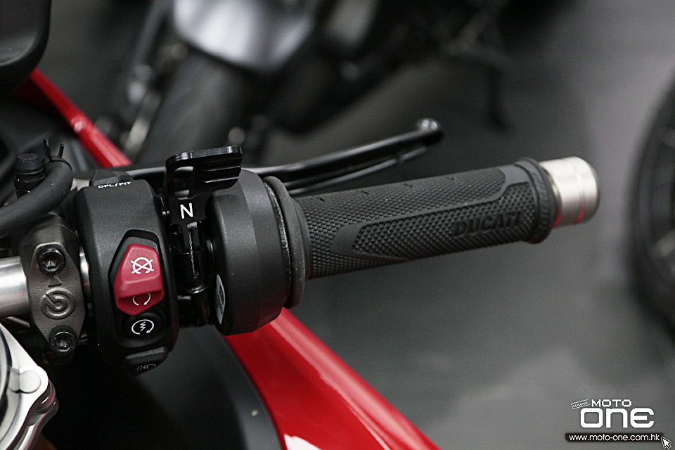 Ducati Neutral Lock與手把控制—為了防止在降檔過程中意外從1波切入空波,Ducati開發了名為Ducati Neutral Lock的專利系統。若要進入空波,騎士必須操作位於右側手把上的專屬撥桿,這與MotoGP和V4R WSBK廠車操作方式完全相同。