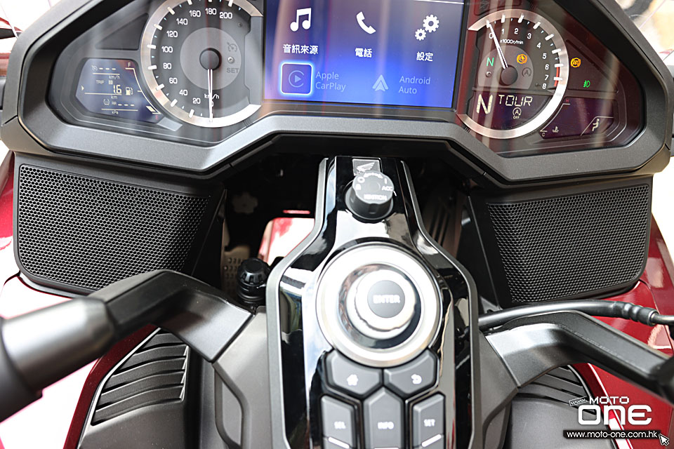 ●齊全電子裝備 圖片顯示預設的TOUR(巡航)馬力模式;新GOLD WING轉用電子油門後,為騎士提供Tour(巡航)、Sport(運動)、Eco(省油)及Rain(濕地)的馬力模式。而電子避震、電子風擋高度、油門反應、ABS防鎖死煞車也會按每個模式自行設定,例如騎士喜歡敏捷加速力可選用Sport(運動),電子避震設定較硬,讓騎士可更穩定地攻彎。喜歡舒適巡航可選用Tour(巡航),電子風擋升至最高,HSTC循跡系統只有選用Tour模式後才介入(其他模式不訪循跡系統)。要達至省油及避免濕地打滑可選用Eco(省油)或Rain(濕地)。而圖左顯示騎士圖案是避震預載調校,騎士可選擇雙騎、單騎或雙騎/行李的設定,換句話有不同吸震效果。
