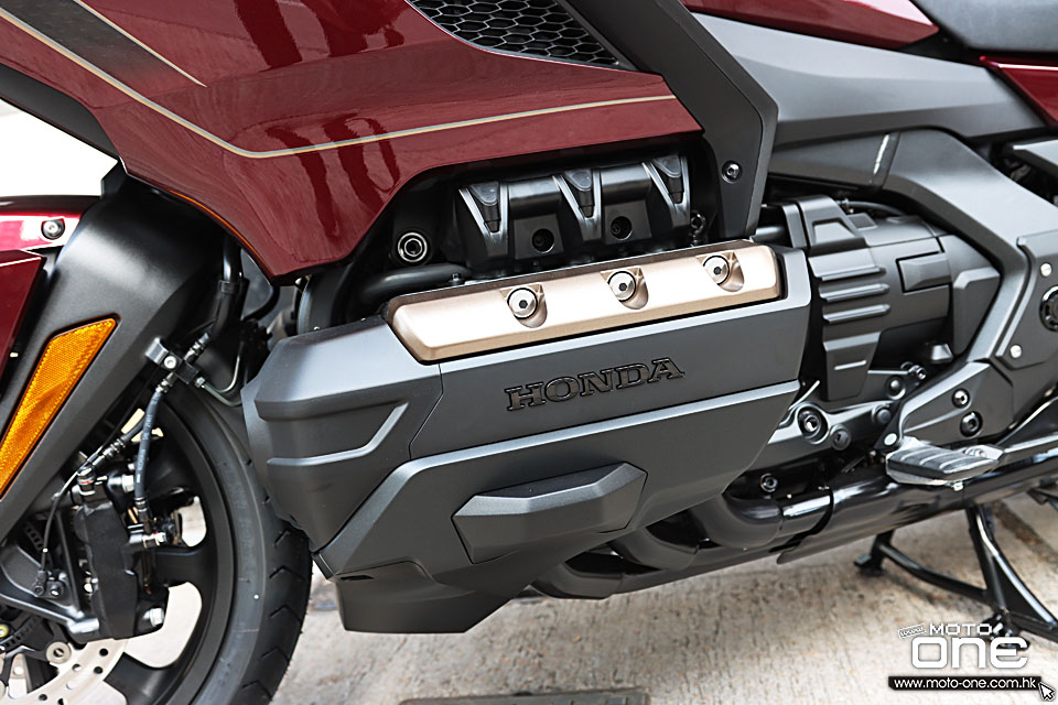●體積更細更高性能的水平對向6缸引擎-1,833cc 水平對向6氣缸引擎已成為HONDA GOLD WING的標記,而上一代的引擎只是使用單凸輪軸SOHC每缸2氣門規格,新引擎卻是每缸4氣門,意味著有更高馬力及扭力輸出。理論上,使用4氣門的新引擎理應更大更重,但廠方為了達到減磅瘦身及更多馬力輸出目標,因此移植HONDA越野車-CRF的Unicam氣門機構,好處是配置搖臂的單凸輪軸發揮雙凸輪軸DOHC的優點,控制每缸4氣門,加速力及扭力較舊引擎提升之餘,配合其它新科技下,廠方表示燃油效益提升20%,換句話說更省油,即使新GOLD WING使用21升油缸,較舊款少4升,但注滿氣油後的總行駛里數不少於舊GOLD WING,而更細容積油缸的好處是可以縮減車身體積及減少重量。