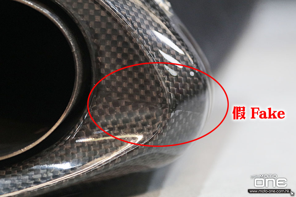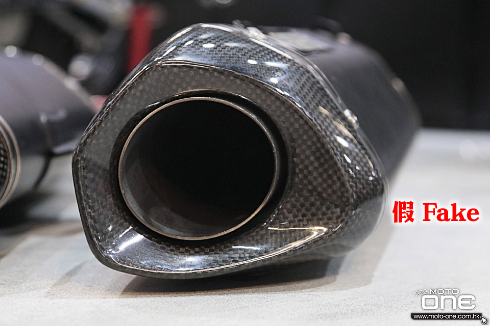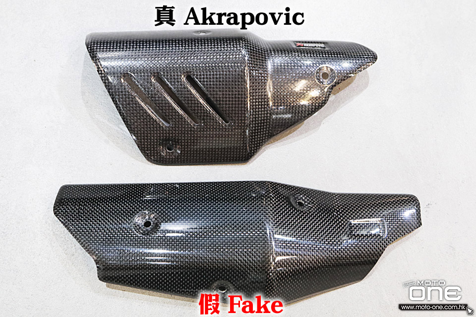 真Akrapovic 是全碳纖維製造,假Fake背後是一片膠板。
