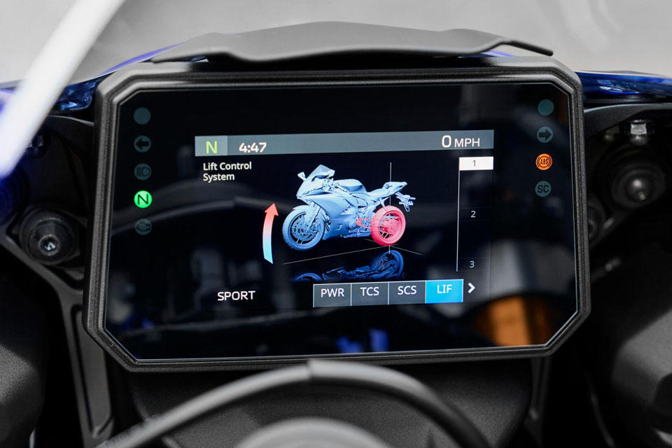 除此之外,還有循跡控制 (Traction Control)、側滑控制 (Slide Control) 、煞車控制 (Brake Control)、拖波的引擎煞車Engine Brake Management (EBM) 及ABS等等,與源自R1的6軸IMU互相配合,持續監測著車身動態與輪胎抓地力。