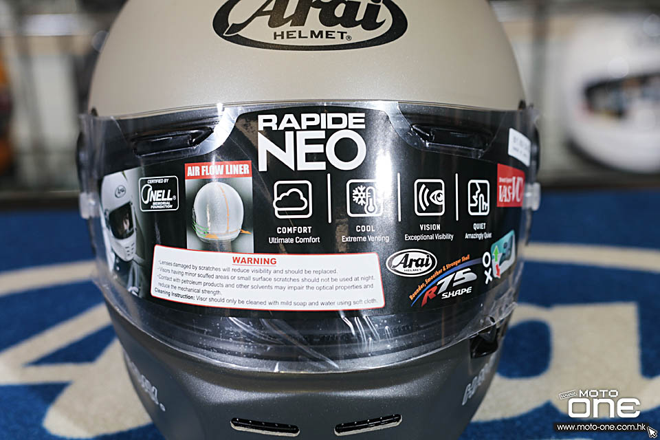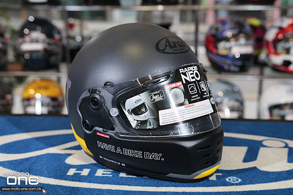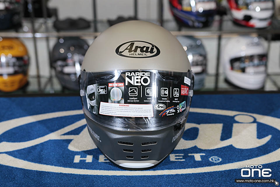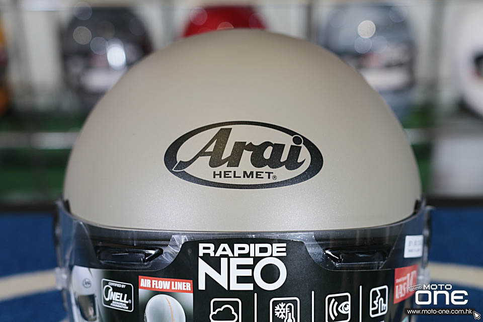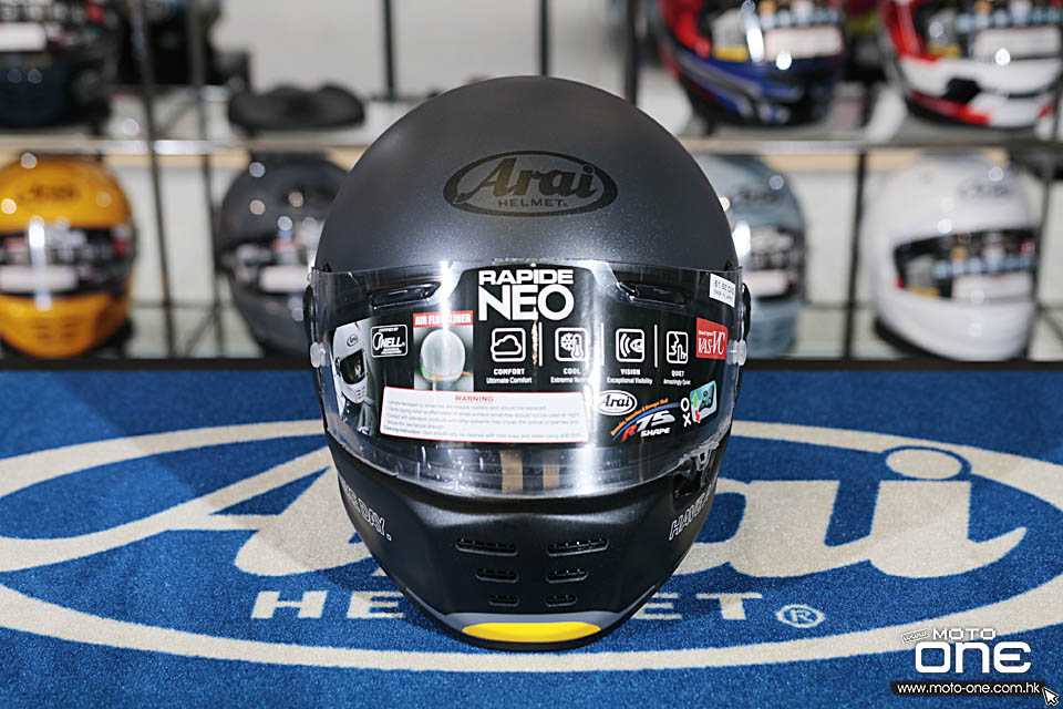 RAPIDE-NEO採用無外部通風帽體,嘴部三個開口的80年代的經典設計,但同時具有最高的安全性和舒適性。 除了Arai的首個內部通風系統,RAPIDE-NEO內部的用料功能相當於賽車型號RX-7X,並符合Snell安全標準。 RAPIDE-NEO頭盔不僅匹配古董電單車,還匹配具有最新性能的"Neo Classic"復古電單車。