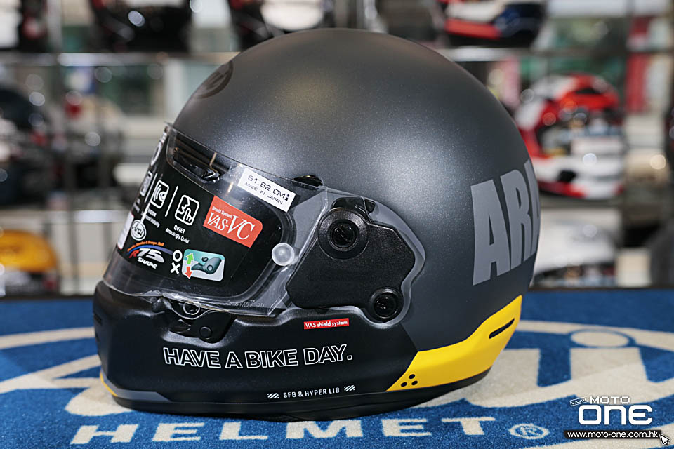 ARAI RAPIDE-NEO「HABD - HAVE A BIKE DAY」的拉花走簡約復古路線,整體沒有花巧圖案,而是以大面積純色配搭粗體字樣,營造出強烈的 old school 味道。頭盔兩側及後方印有醒目的「ARAI HELMET」大型字樣,帽嘴位置則加入「HAVE A BIKE DAY.」字句,視覺上帶點美式復古玩味,同時又不失街頭個性。