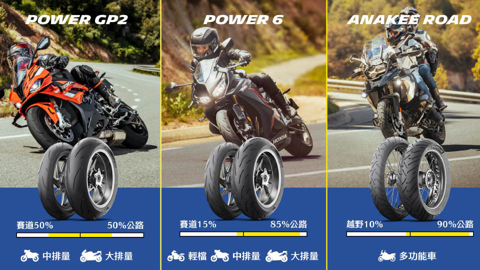 其實對一般騎士而言,在街道上好難用盡它們的咬地力,所以胎廠同時推出相對實用的街胎,略略調低咬地力,但不失跑車胎的性能,損耗速度慢一點,耐用一點,排水胎紋多一點,濕地冇咁容易滑胎,而新款POWER GP 2及新款POWER 6均屬於這類型街胎,但是它們的定位其實都有分別。以POWER GP 2為例,依然則重乾地的咬地力,但濕地排水性能及耐用度較POWER CUP 2稍高,因此仍然屬於激跑型街胎,而POWER 6注重日常行街的實用性,所以濕地排水性能及耐用度在三款輪胎中最好,即使終極的乾地咬地力不及POWER CUP 2及POWER GP 2勁,但實際上足夠大部份騎士使用。