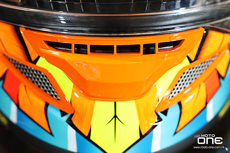 HJC RPHA 12 SPASSO 頭盔以其獨特的藝術拉花設計,採用了鮮豔的藍色基調,配合色彩斑斕的圖案和大膽的線條,形造出充滿活力和動感的視覺效果。拉花中最引人注目的元素是頭盔頂部和側面的大眼貓頭鷹圖案,貓頭鷹的雙眼炯炯有神,色彩豐富,增添了一份獨特的神秘感和視覺衝擊力。