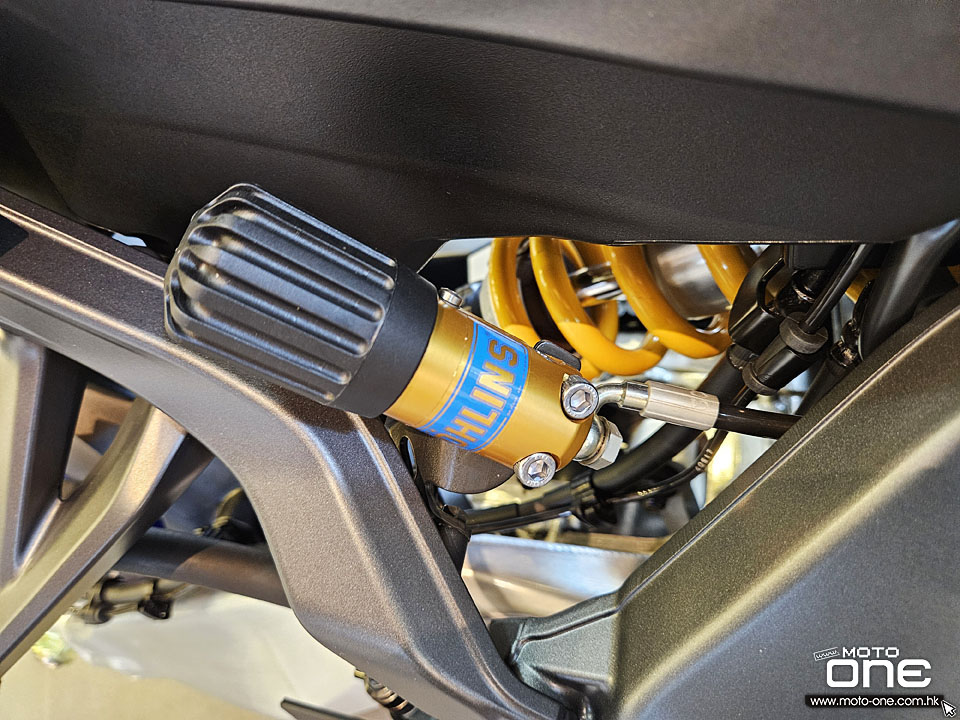 後避震則使用高級OHLINS避震,並配備遠端調校器,令調整更加快速、方便,整體提升了騎乘穩定性。