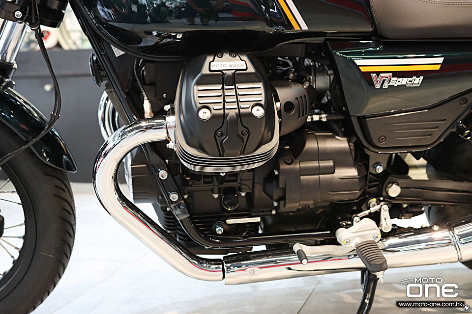 Moto Guzzi V7 Special 的引擎是唯一一款帶軸驅動的 90° 橫向風冷 V 型雙缸引擎。升級到歐盟 5+ 標準,排氣量為 853 cc,在 6900 rpm 時輸出 67.3 hp,在 4400 rpm 時輸出 79 Nm 的扭矩,在中低轉速下表現尤為出色。簡而言之,性能更先進、效率更高,當然還有獨特的 Moto Guzzi 聲音。
