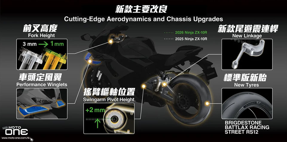 2026 2026 ZX-10R/ZX-10RR再進化 KAWASAKI對 2026 年 Ninja ZX-10R/ZX-10RR進行大幅更新,重點包括: