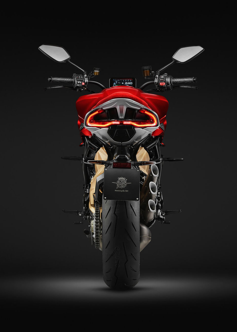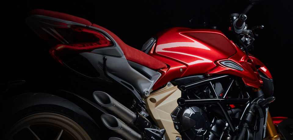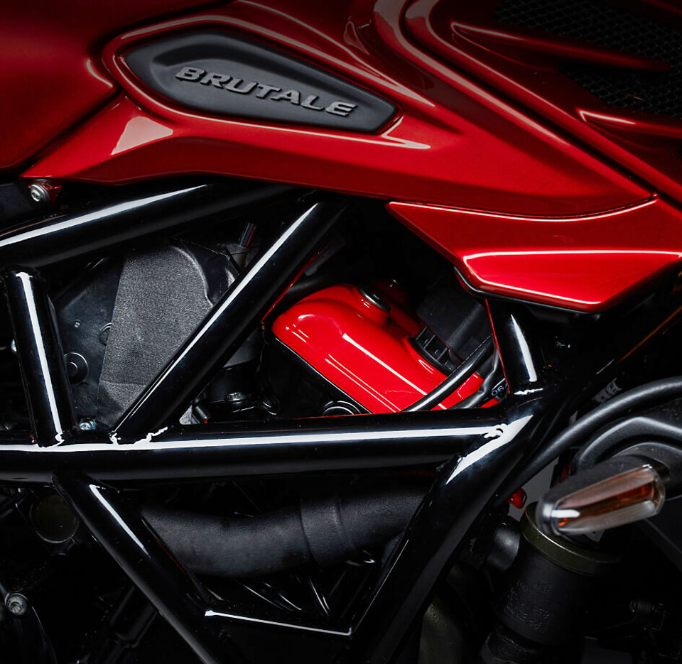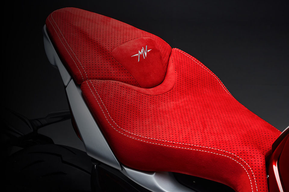 車身幾何經過重新設計,配上全新軑把、腳踏位置與油缸造型,提供更自然、更好操控的騎姿。座墊亦完全重新開發,使用紅色 Alcantara 麂皮包覆,墊層更寬厚,並採用新密度泡綿以兼顧舒適與支撐力。軑把位置較高且更前,改善操作槓桿感,同時新包圍與車身線條延續 Brutale 系列的設計,結合傳統美學與現代空氣動力學。