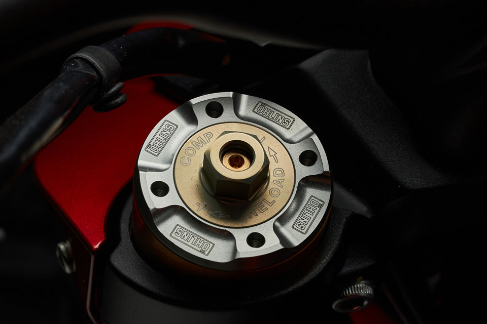 懸吊與煞車系統 避震使用 Ohlins,全套高規配備:前叉為 NIX 30 43mm 倒立式前叉,後避震為 TTX 36,提供壓縮、回彈與預載調校。煞車系統採用頂級 Brembo Hypure 放射式卡鉗、17mm 直推式煞車總泵、320mm 前雙碟及 220mm 後碟。