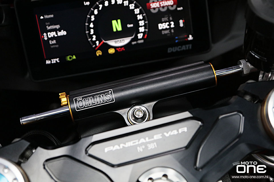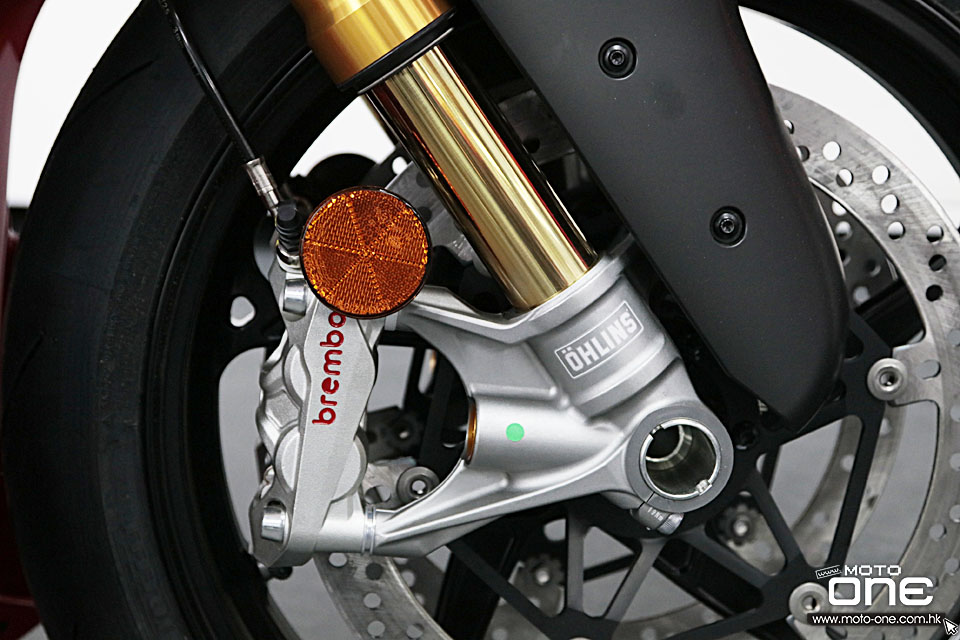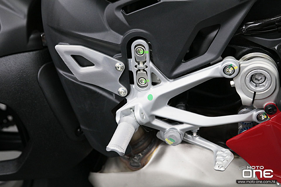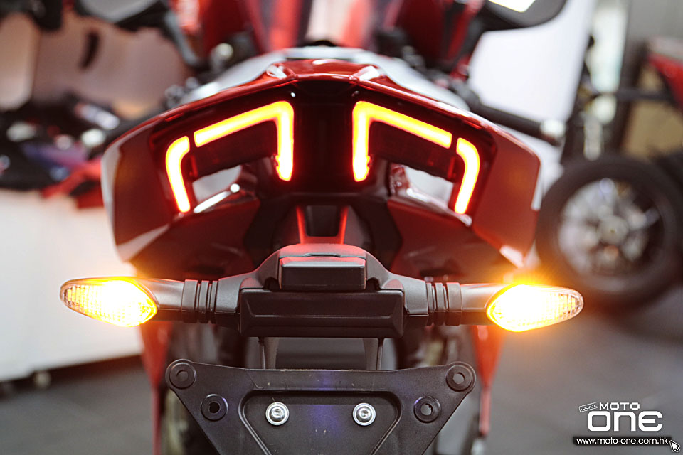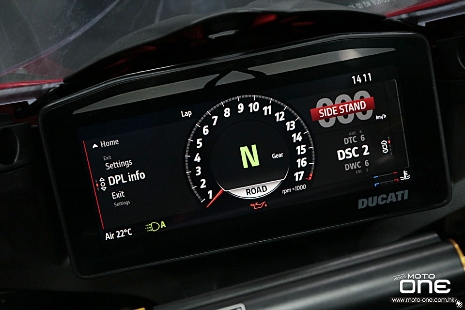電子設備 全新 Ducati Vehicle Observer (DVO),模擬 70 個外部感測器,提升電子輔助反應。 慣性測量單元移至油缸下方,更接近重心,反應更準確。 功能包括:循跡控制 (DTC)、翹頭控制 (DWC)、側滑控制 (DSC)、彈射起步 (DPL)、引擎煞車控制 (EBC),全部可於行車中快速調整。 煞車防鎖系統有 7 個級別,分別適用賽道或公路。騎乘模式共有 5 種:Wet、Road、Sport、Race A、Race B。