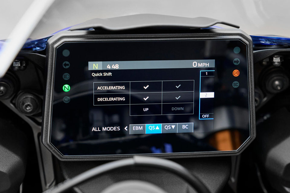 第3代快排系統(Quick Shifter): 除了升檔之外,拖波減速都不用扣極力子牛角。這套快排在車速超過16km/h時可運作,升檔的引擎轉速為2,000rpm以上,降檔則需在1,600rpm以上。