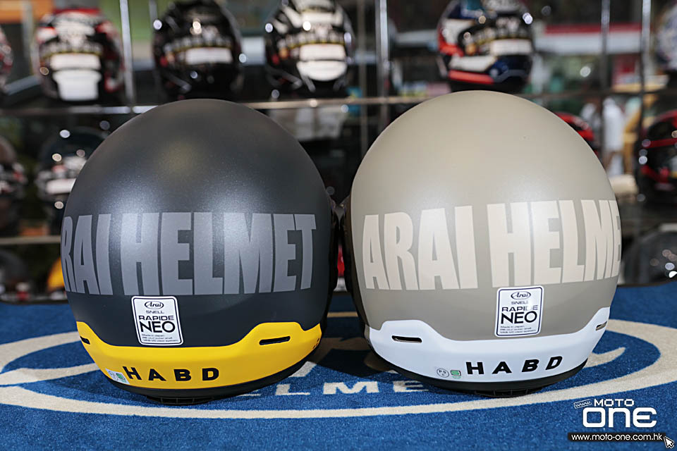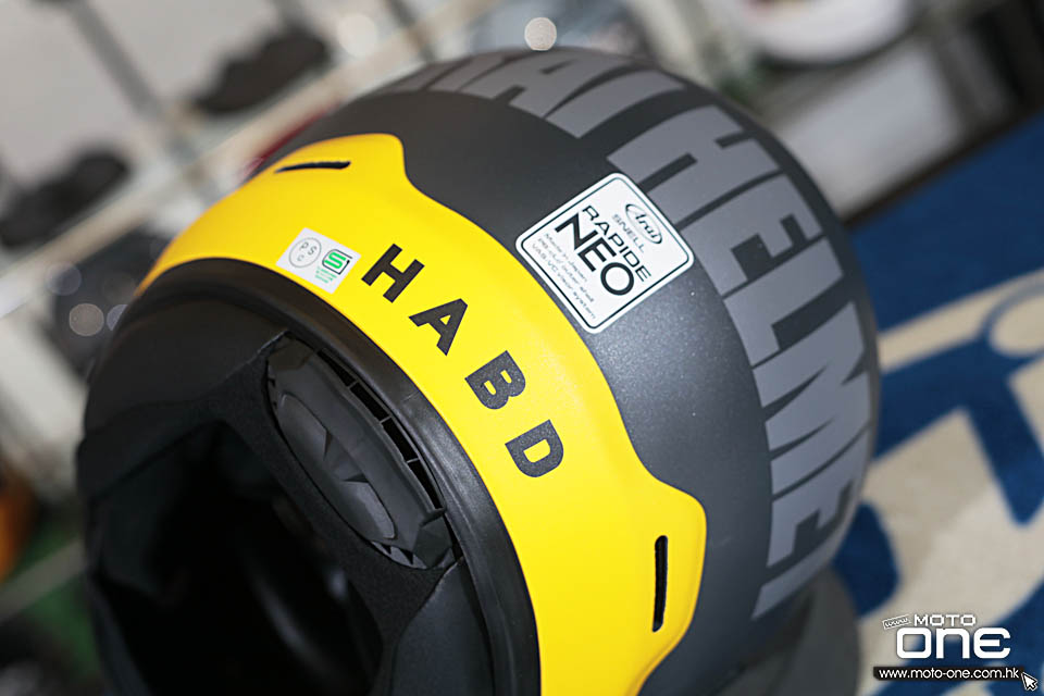 配色方面,今次相片所見有兩款主調,一款採用淺灰配白色下擺,感覺較柔和清爽;另一款則用深灰配鮮黃色下擺,對比更強烈,視覺效果亦更搶眼。兩款都配合啞面質感處理,令整體觀感更有質樸味道,十分切合 RAPIDE-NEO 這類 neo classic 全面頭盔的定位。整體而言,這款 HABD 拉花特色在於字體設計鮮明、配色簡潔有性格,低調之中又有很高辨識度。
