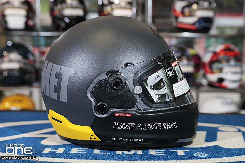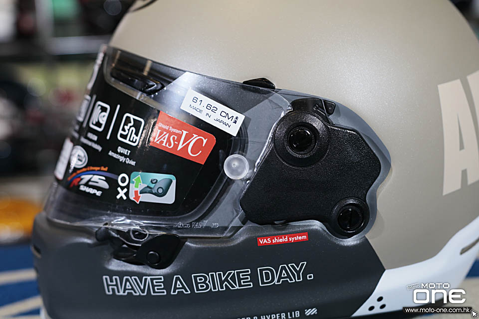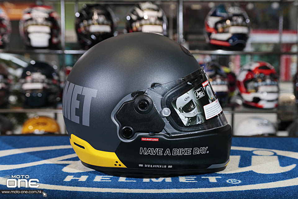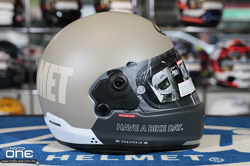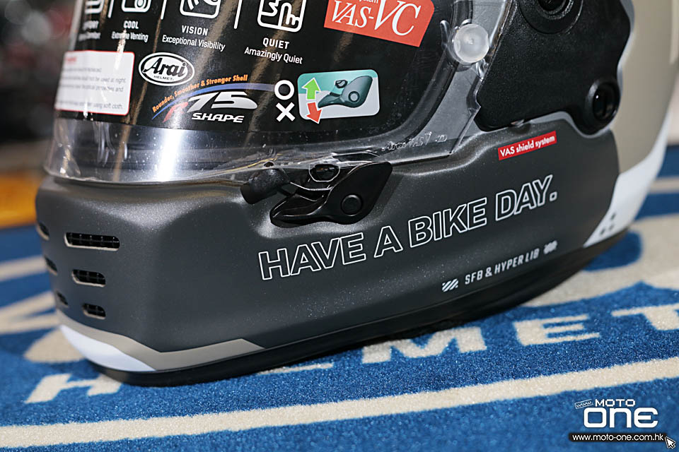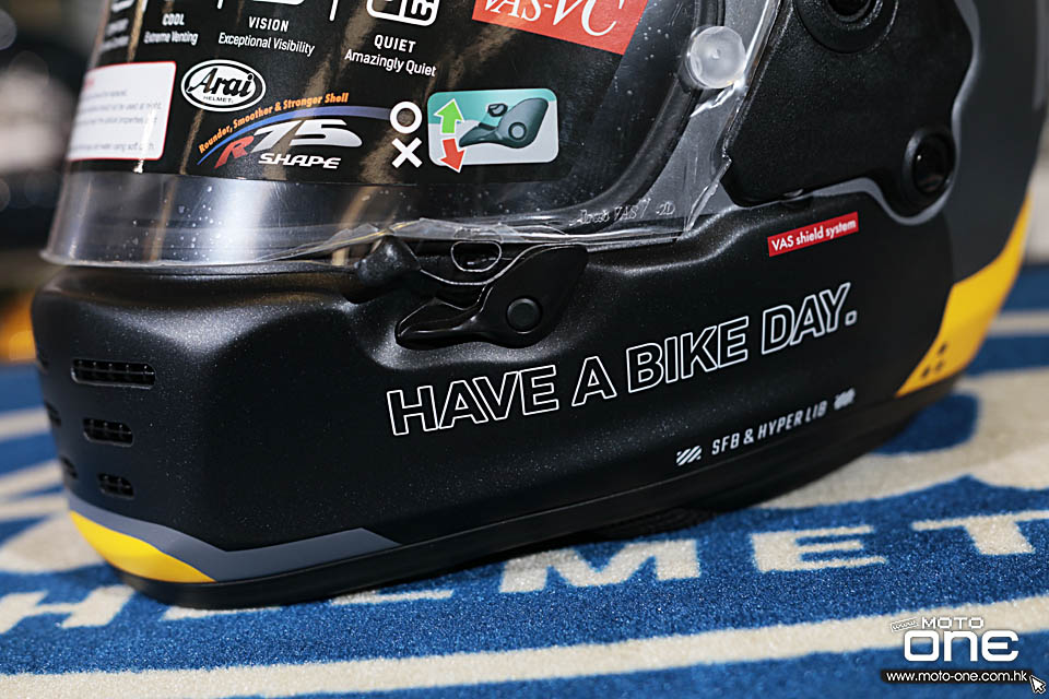 ARAI RAPIDE-NEO「HABD - HAVE A BIKE DAY」的拉花走簡約復古路線,整體沒有花巧圖案,而是以大面積純色配搭粗體字樣,營造出強烈的 old school 味道。頭盔兩側及後方印有醒目的「ARAI HELMET」大型字樣,帽嘴位置則加入「HAVE A BIKE DAY.」字句,視覺上帶點美式復古玩味,同時又不失街頭個性。